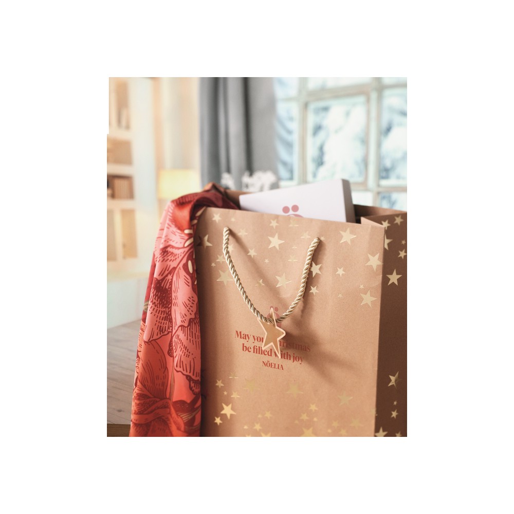 Elegáns kraftpapír ajándéktasak ünnepi mintával. Ajándékkísérő címkével. 250 g vastag papír. Ez a stílusos és ünnepi motívummal díszített papírtasak tökéletes csomagolás egy különleges személynek szánt, átgondolt ajándék számára. Egy tetszetősen becsomagolt ajándékot átadni már fél siker! FSC® -certified | FSC RECYCLED, P5.3, FSC-C213206