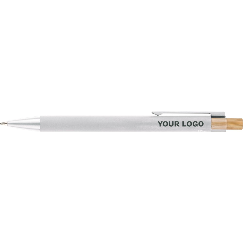 Újrahasznosított alumíniumból készült golyóstoll bambusz nyomógombbal és AS műanyag díszítéssel, fém klippel és a toll színével harmonizáló műanyag tollheggyel. A tolltesten lézergravírozott recycled (újrahasznosított) alapanyagra utaló logó található. Megközelítőleg 800 méter íráshosszúságú, kék színű tollbetéttel.