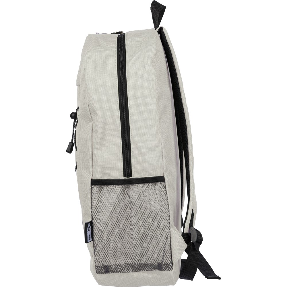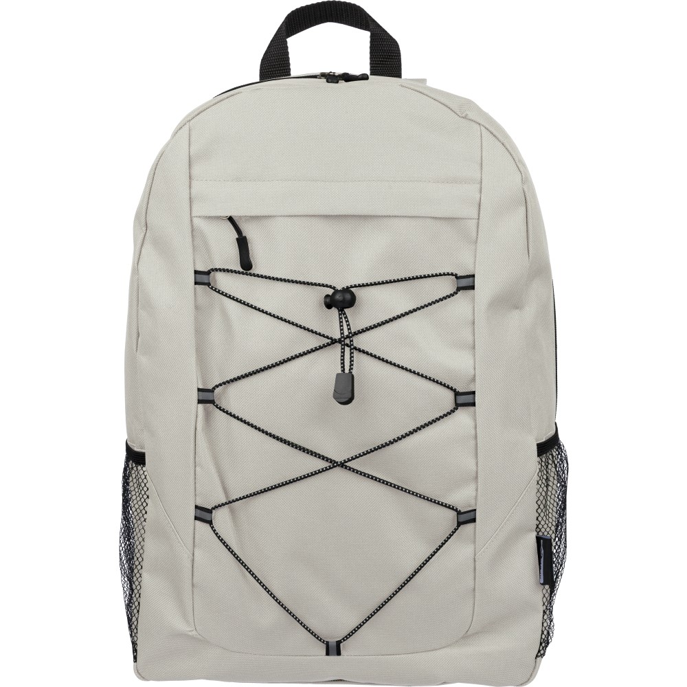 RPET poliészter 600D anyagból készült hátizsák húzózsinóros záródással és nagy cipzáras fő rekesszel. Hálós oldalzsebekkel, rugalmas elülső pántokkal, dekorációhoz kialakított kis elülső cipzáras zsebbel és állítható vállpántokkal rendelkezik. A terméken rPET alapanyagra utaló címke található.