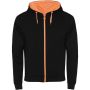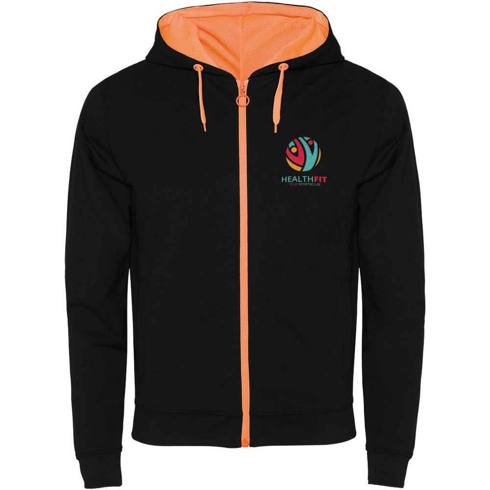 Pulóver neon színű részletekkel. Középső cipzár kontrasztos zsinórral. Kapucni mikropórusos poliészter béléssel és kontrasztos neon színnel. Húzózsinór és fém szemek kontrasztos neon színben. Rugalmas 1x1 kötésű passzék. Két elülső zseb széles szegéllyel. Megerősített, fedett varrások a belső galléron. Levehető címke.