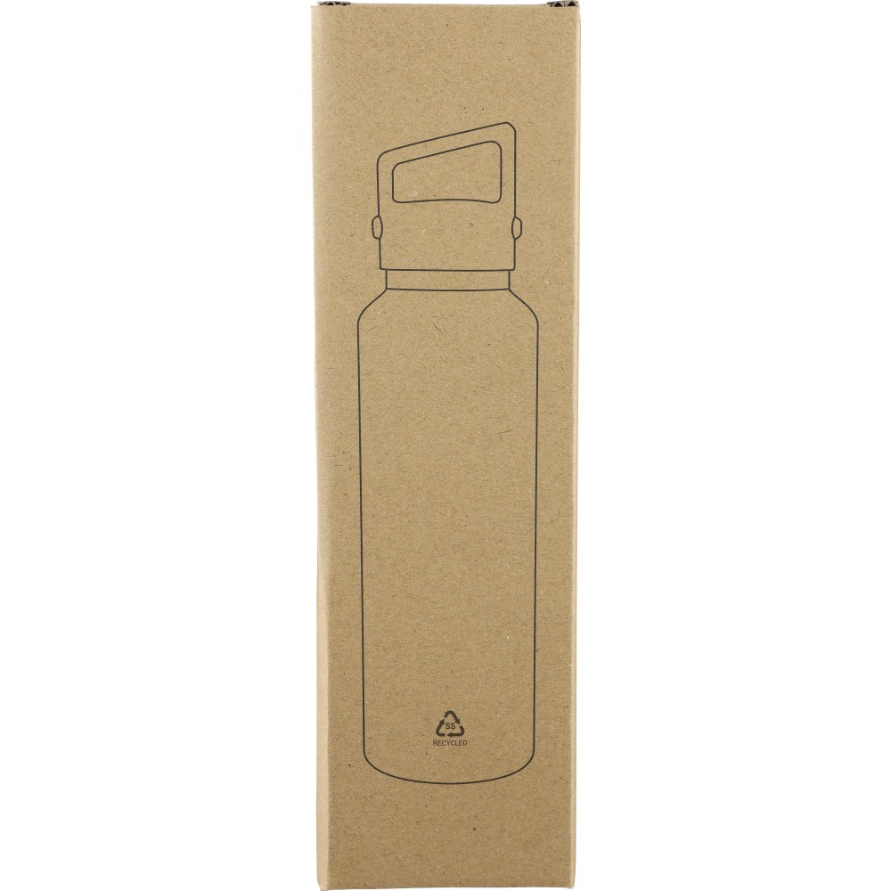 Újrahasznosított rozsdamentes acélból készült, vákuumszigetelésű palack 600 ml űrtartalommal, duplafalú kialakítással, hordozófüllel ellátott PP fedéllel és kétféle (dupla) nyitási lehetőséget biztosító nyomógombos rendszerrel. A palacktesten lézergravírozott recycled (újrahasznosított) alapanyagra utaló logó található. Darabonként barna kartondobozba csomagolva.